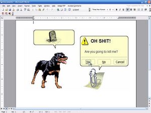 The Microsoft Word Paperclip or Clippit (also known as "Brendan" or "that annoying paperclip") is most commonly known as one of the many office assistants from Microsoft Office Thespian Troupe, Chapter 1337, otherwise known as the MOTT. It is the best known as the most annoying paperclip the earth has ever seen. He is a Meisner actor by trade, but holds a professional degree from Stanford University in Organizational Management. He has become one of the most widely debated and controversial icons of Microsoft Office, with consumer feelings ranging from intense love to absolute hatred (passing from the former to the latter after your first 3 minutes ever on a computer; Clippy's mood-altering effects still lack FDA approval).