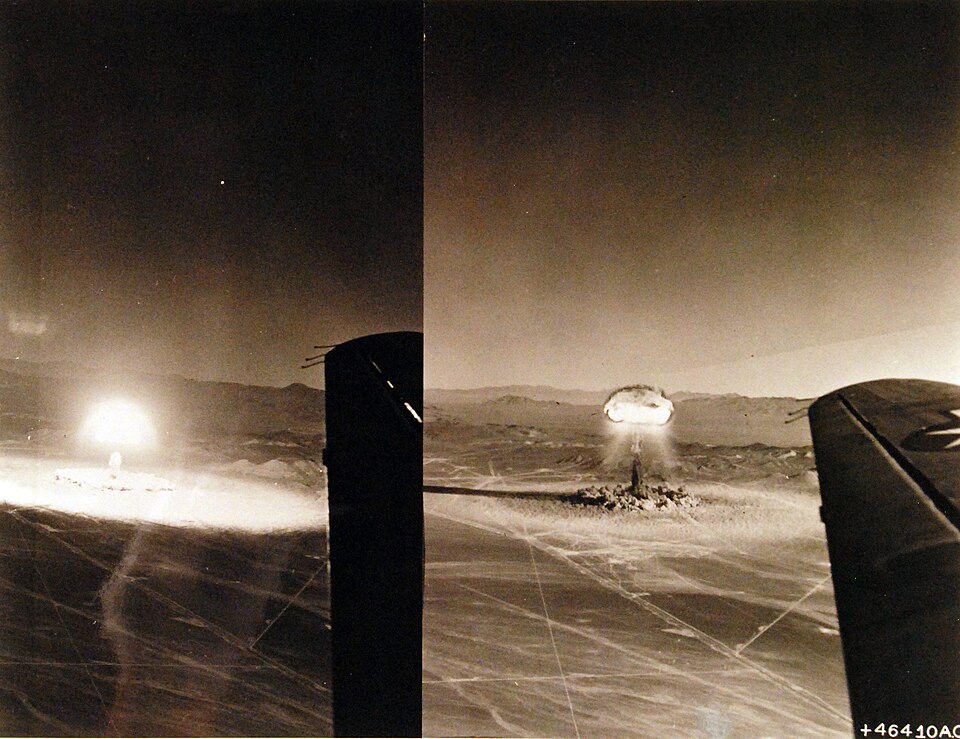 | Description330-PS-3256 (46410 AC) (17204876720).jpg | 330-PS-3256 (46410 AC): These two aerial views of an atomic explosion were photographed from a U.S. Air Force observer aircraft during one of the continental nuclear tests, conducted over the past two years by the Atomic Energy Commission in the Nevada desert in which Department of Defense participated. U.S. Air Force aircraft not only delivered the weapon to ground zero, but also monitored the whole test area with observer aircraft who perform many duties. These duties include cloud tracking, camera ships, cloud sampling aircraft and other technical aircraft with specific scientific missions. Photograph released March 16, 1953. (5/5/2015). | |||