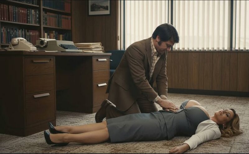 A well trained corporate employee is provinding first aid to save a collegue's life. Atta'boy Bob!