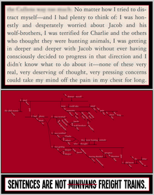 Twilight is a book about hardship and boyfriends and vampires, and it is also hard—to read, that is; the author, Stephanie Meyer, fills it with parentheticals and asides that sometimes get so far off track that it's hard to tell what the sentence, let alone paragraph, was even about, and sometimes, sometimes it gets to the point where the entire thing might as well be a nice, long, careening, self-contradictory minivan, because it's hard to tell where the entire thing is going when it's not going anywhere—which is hard, like Edward Cullen and Jacob... Jacob whatever his last name is; everyone just refers to him as Jacob (and he doesn't even appear much in this one anyway).